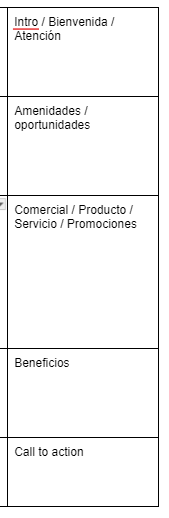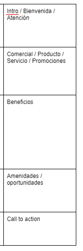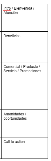 Estructura 1:Intro / BienvenidaProducto / Servicio / Promociones / $BeneficiosAmenidades / OportunidadesCall To Action